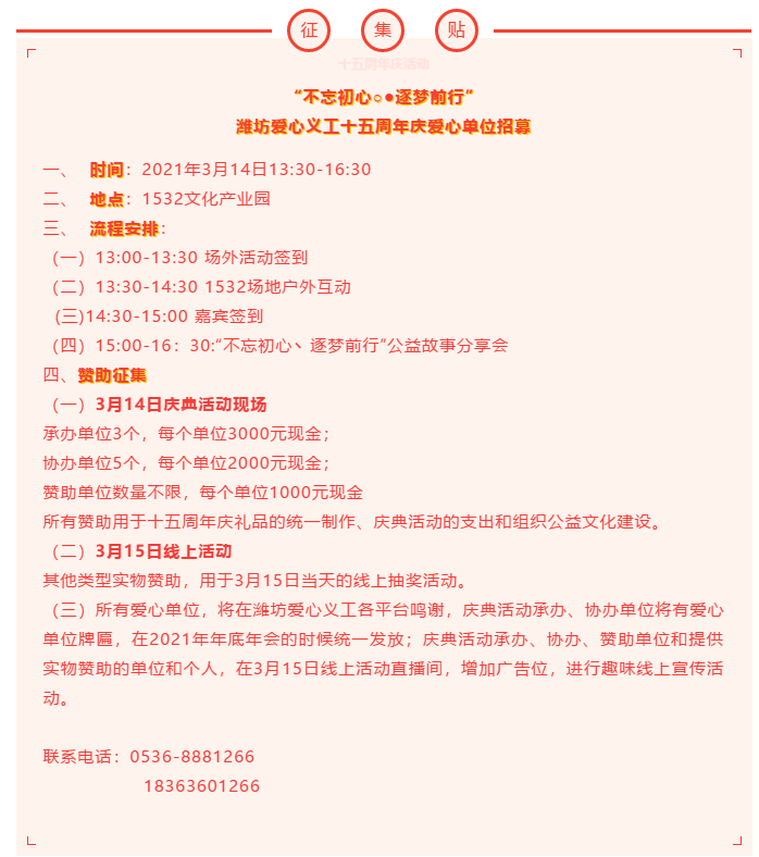 【周日】3月14日“不忘初心○●逐梦前行”潍坊爱心义工十五周年庆典招募通知