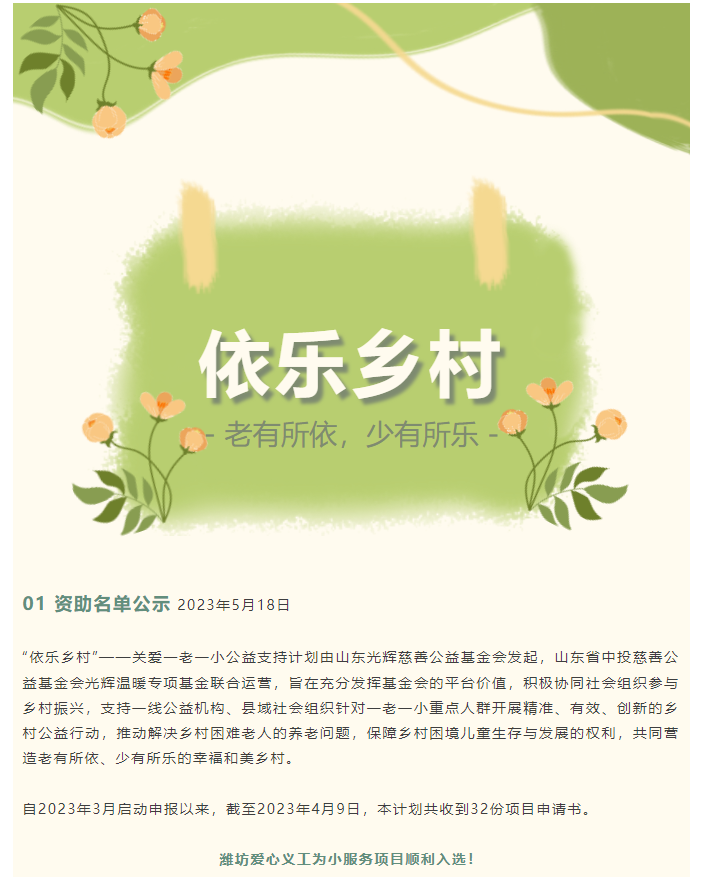 【喜报】潍坊爱心义工入选首期“依乐乡村”—关爱一老一小公益支持计划