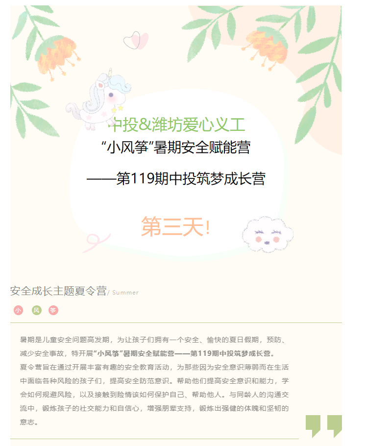 潍坊爱心义工“小风筝”暑期安全赋能营——暨第119期中投筑梦成长营第三天活动纪实